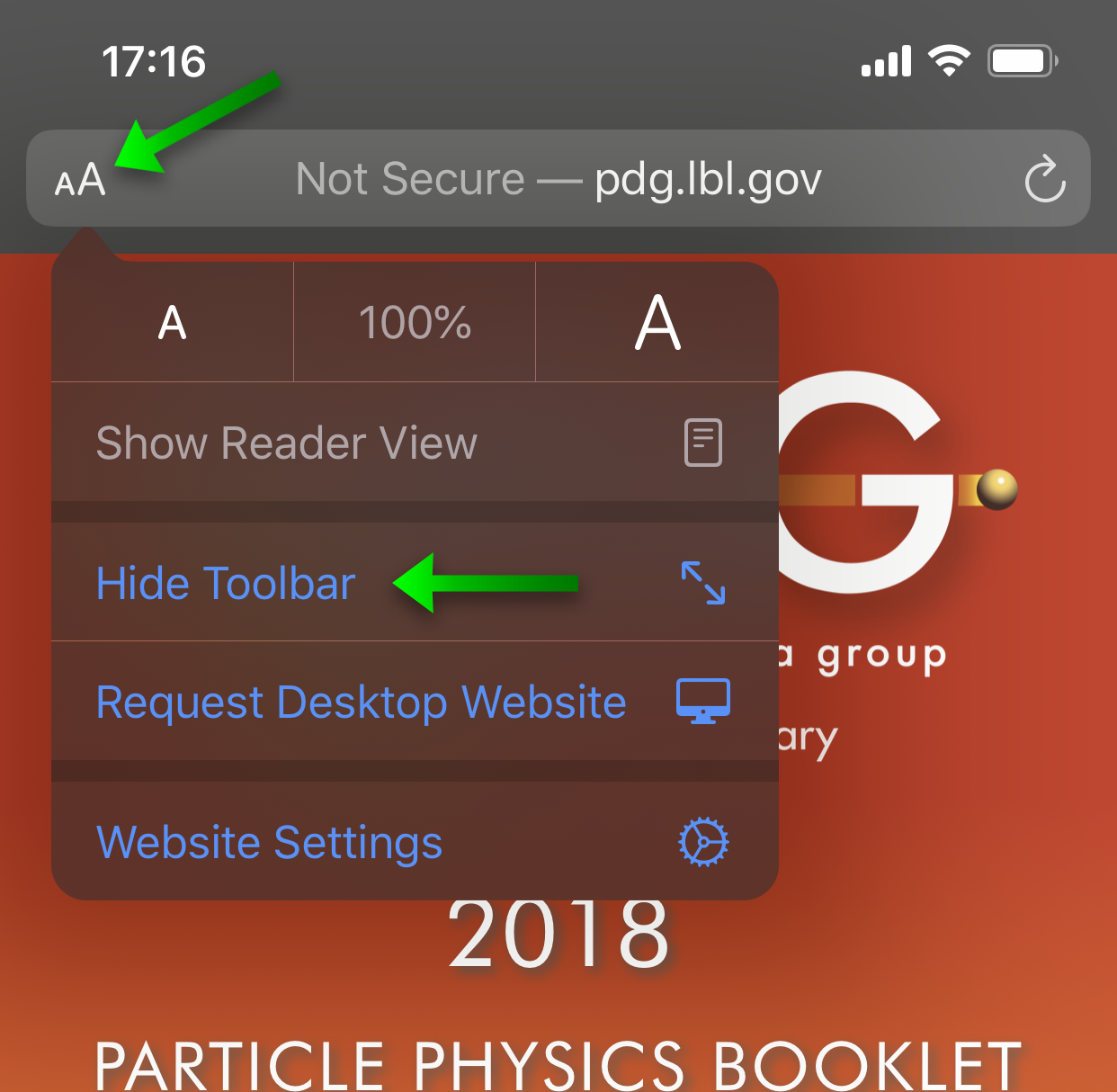 To experience the app in full screen mode on iOS Safari, simply press the "aA" in the upper left of the URL window and then press "Hide Toolbar".